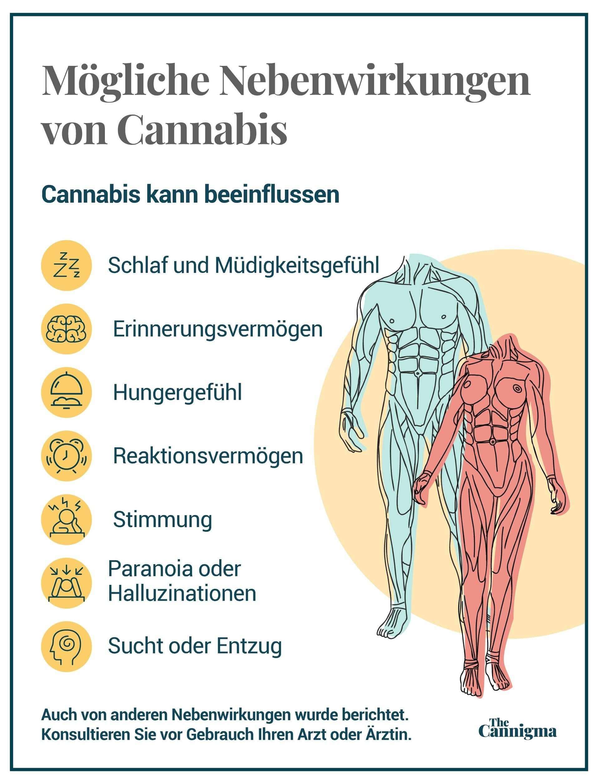 Frühere Studien am Menschen mit Cannabis zur Behandlung von Krebs und seinen Symptomen haben jedoch keine signifikanten Nebenwirkungen gezeigt. Obwohl weitere klinische Studien erforderlich sind, wird davon ausgegangen, dass Cannabis insgesamt ein gutes Sicherheitsprofil mit geringfügigen und vorübergehenden Nebenwirkungen aufweist.