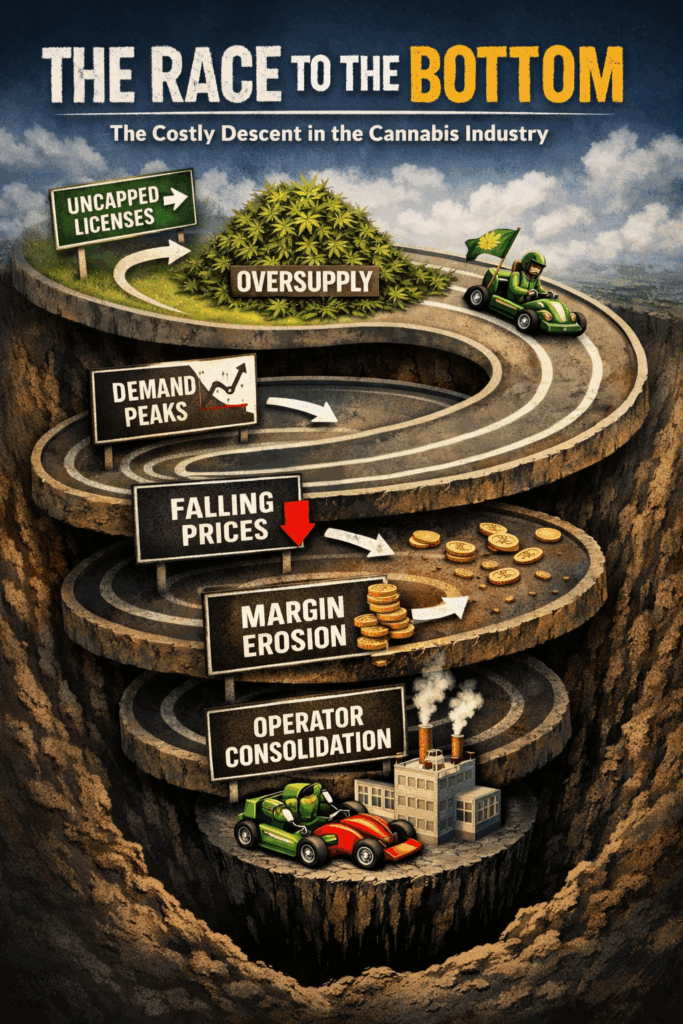 This pattern is now widely documented, and it’s driven by a mix of regulatory, economic, and structural forces, the biggest of which is the oversupply that occurs when licenses or cultivation canopy are left uncapped.