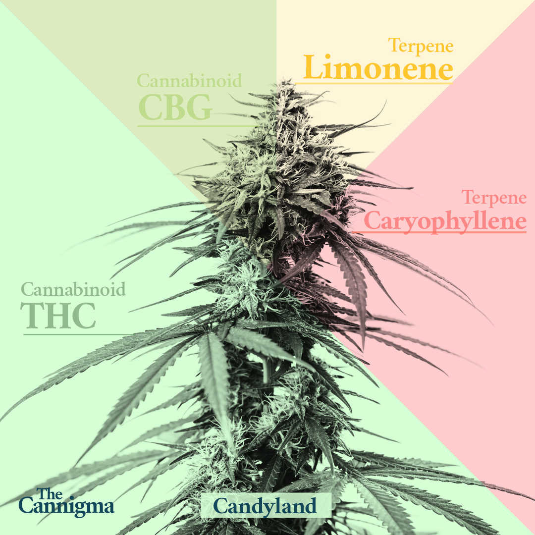 Candyland (at times also referred to as Candyland Kush or Candyland OG) has a sweet flavor with earthy, spicy notes. It produces dense buds that can be dark green with varying degrees of purple.