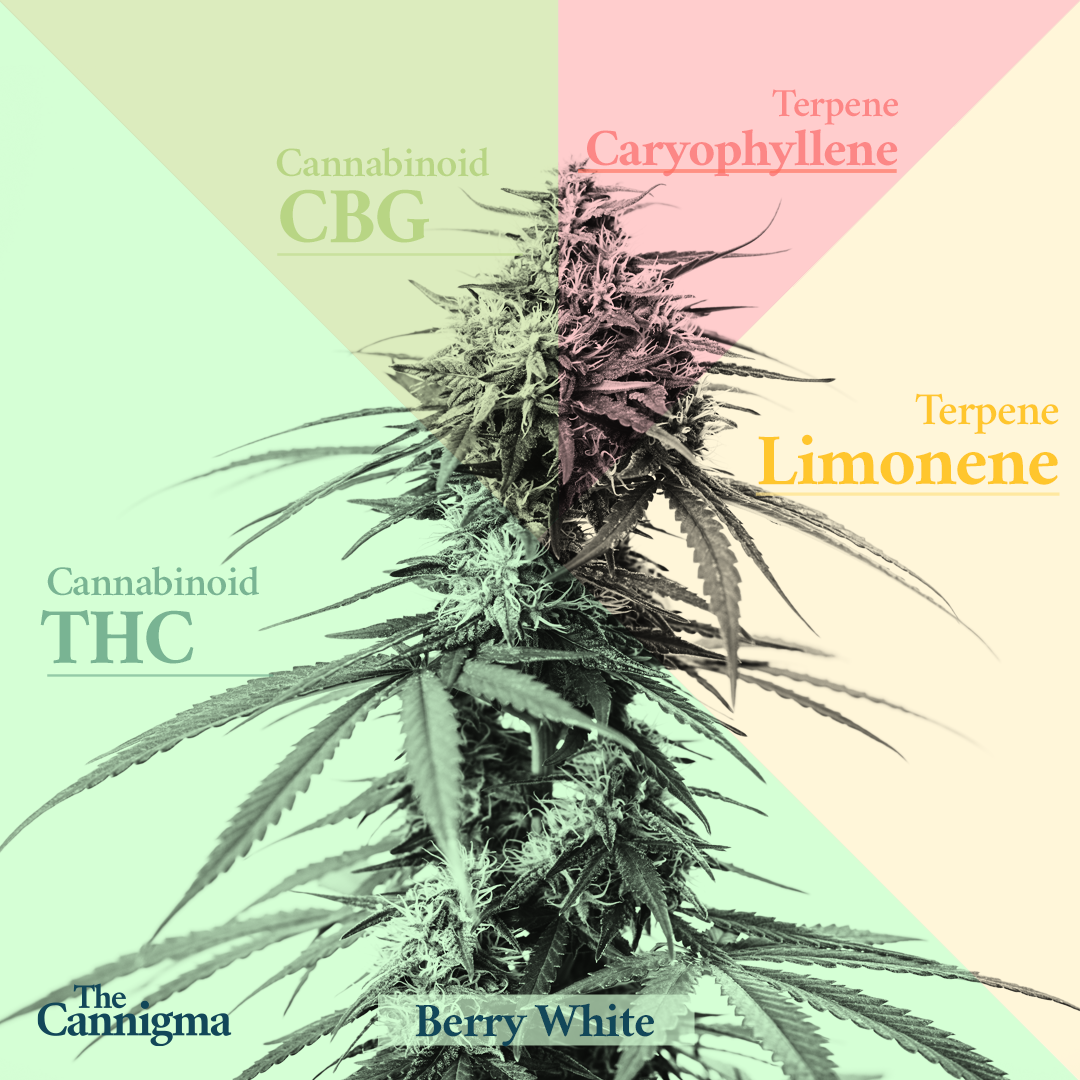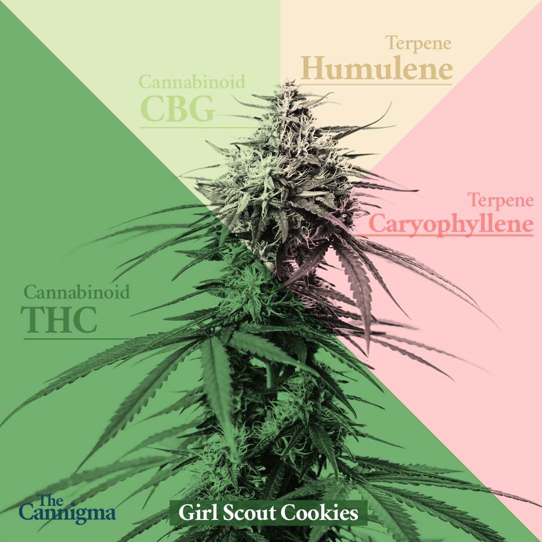 The chemical profile you see below is an average of laboratory tests for products called Girl Scout Cookies — so it’s just an estimate of what you might find when you buy a Girl Scout Cookies strain. It’s often tested with high THC content (averaging 19%) and modest CBG (1%), along with terpenes BCP (0.6%) and humulene (0.3%), limonene (0.3%) and myrcene (0.2%).